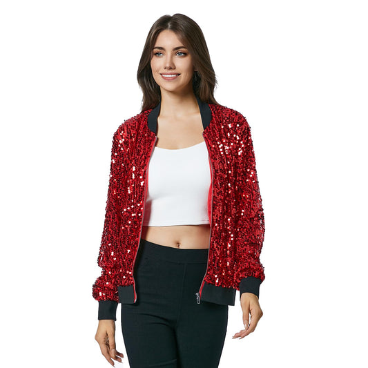 Women's Sequin Long Sleeve Front Zip Bomber Jacket with Ribbed Cuffs