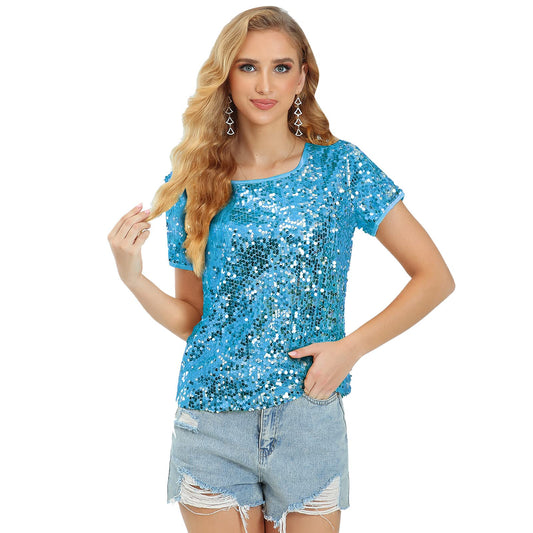 Womens Full Sequin Sparkle Tops Shimmer Glitter Round Neck Short Sleeve Shirt Summer Disco Party Tee Shirts Tunic Blouse